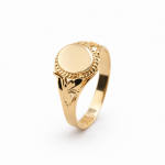 Elegancki złoty sygnet męski o solidnej formie i matowym froncie z dekoracyjnym wzorem.
